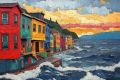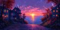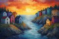 Enigmatic Sunset Over Stylized Coastal Village: A Canvas Print