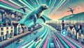 Puffins on a Futuristic Boardwalk Under Neon Lights