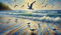 Seagulls Dancing Over Crystal Crescent Waves in Textured Impressions
