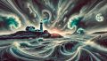 Surreal Maritime Landscape: Red Lighthouse and House Amidst Waves
