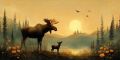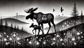 Majestic Moose and Calves Under a Golden Moonlit Sky
