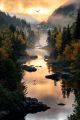 Golden Eagles Soaring Over Serene River Through Forested Valley