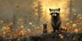Enchanted Twilight: Raccoons Amidst a Glowing Forest Scene