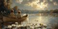 Fishermen Amidst White Water Lilies Against Halifax's Iconic Backdrop