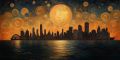 Majestic City Skyline Under a Stylized Cosmic Swirl