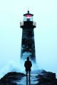 A Solitary Figure Contemplates at a Mist-Enshrouded Halifax Lighthouse