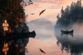 Majestic Dawn: Ravens Glide over Misty Halifax Lake